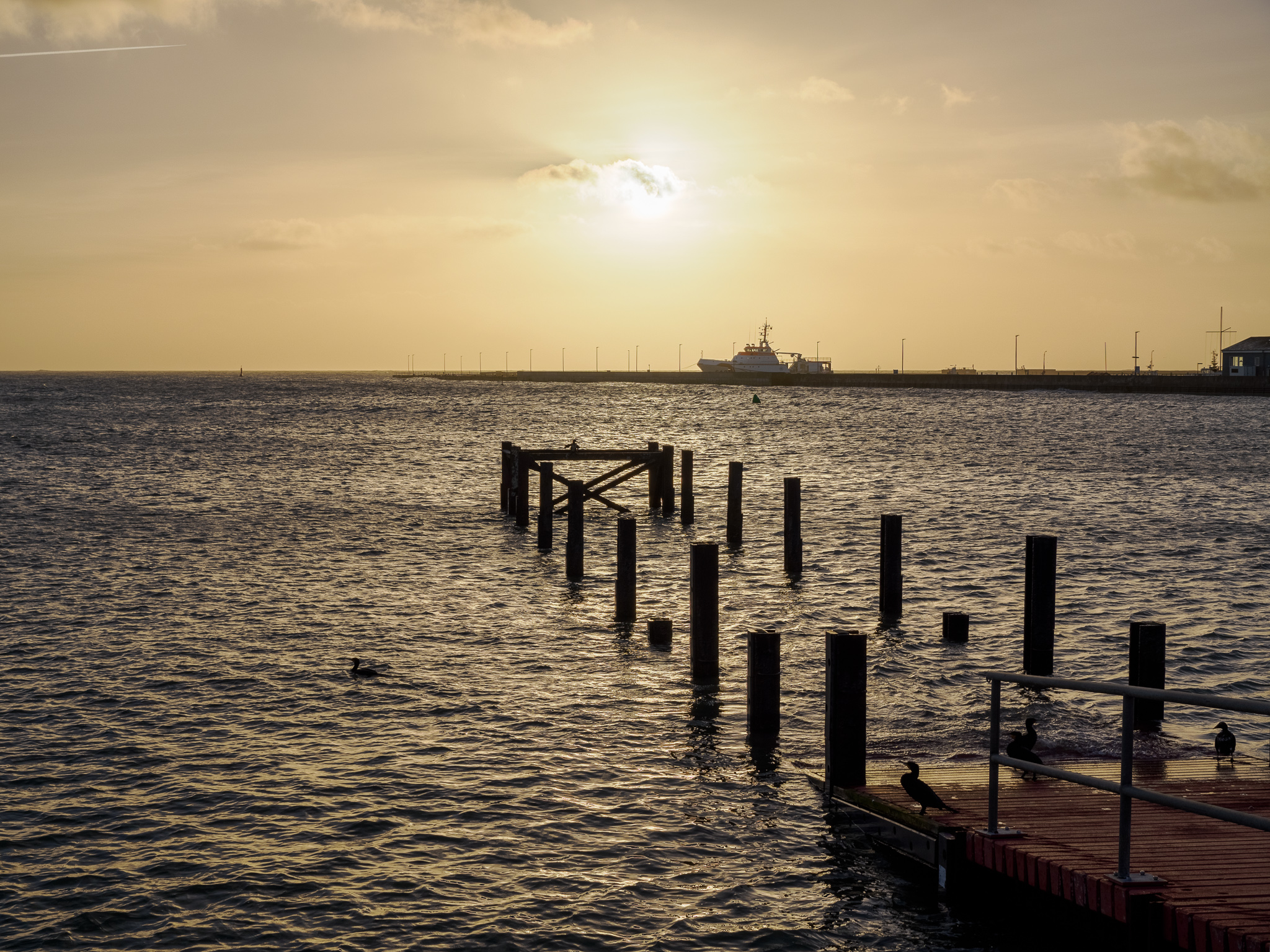 Nic z toho nás neodradilo, a konečně jsme připluli na ostrov Helgoland. Po vylodění přišla silná bouře doprovázená opravdu vydatným deštěm. S batohy na zádech a taškami přes rameno jsme museli v silném lijáku ujít necelý kilometr k ubytování. Ubytovali jsme se blízko pobřeží, je to kousek k loďce, která nás bude převážet na sousední ostrůvek Düne. Dnes už by bohužel nemělo význam jezdit na vedlejší ostrov Düne, je prosinec, a slunce zapadá moc brzy, počkáme na první ranní spoj. Volné odpoledne jsme využili k procházce po ostrově, nákupu potravin a pokusili se najít saunu, která měla být v ceně ubytování, byla však v jiné budově.