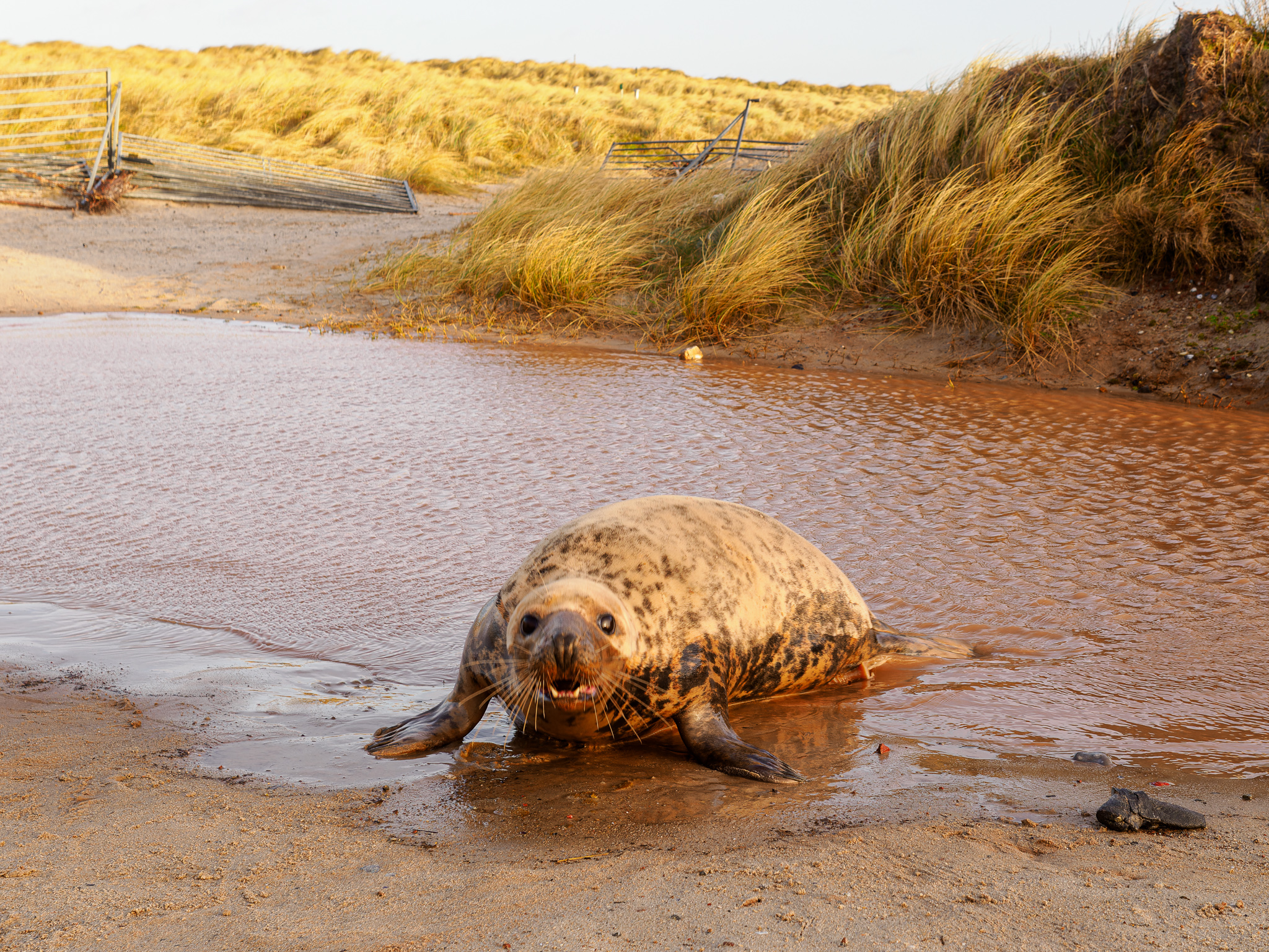 Celkem nás zajímá, jak se nyní tuleni dostanou zase zpět k moři, ale po obchůzce celého ostrova, zjišťujeme, že jsou tam pořád cesty, kudy se mohou k moři dostat. Jeden ze samců leží u zábrany, a zkouší do ní strkat, ochranář mu jde otevřít, ale samec na to měl jiný názor, nadzvedl své obrovské tělo, a převalil se přes metrovou zábranu. Byl to opravdu neskutečný výkon s takovou váhou. Moc lituji, že jsem neměl zrovna v tu chvíli foťák po ruce, ideálně přepnutý na video.