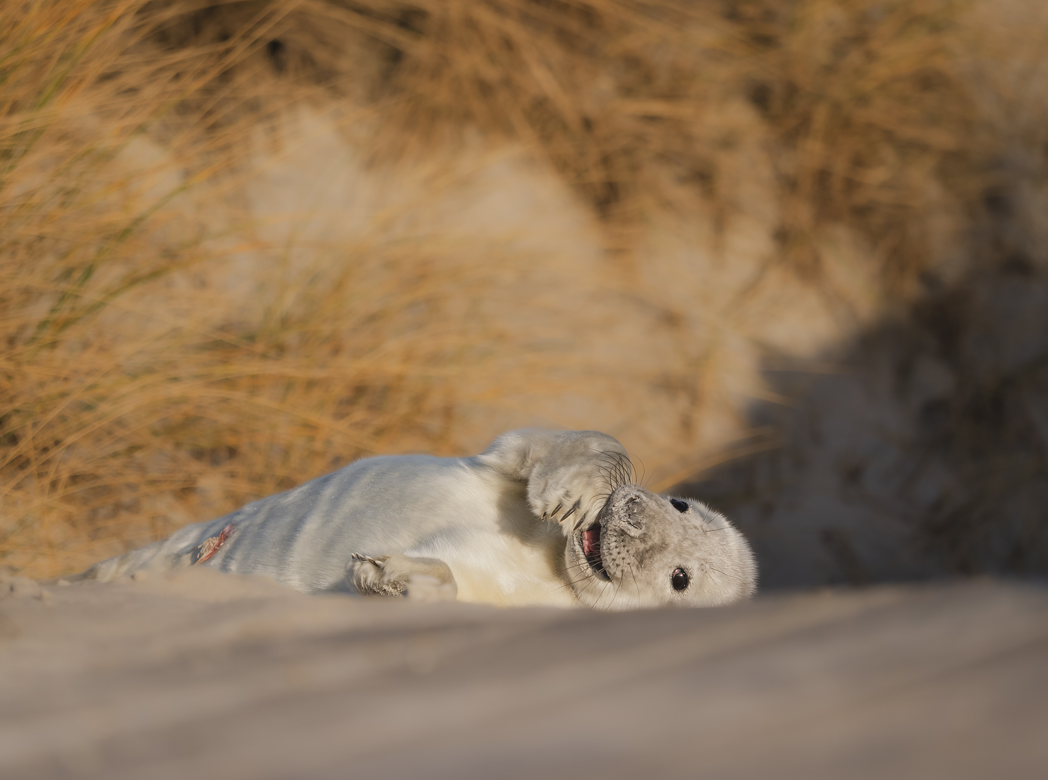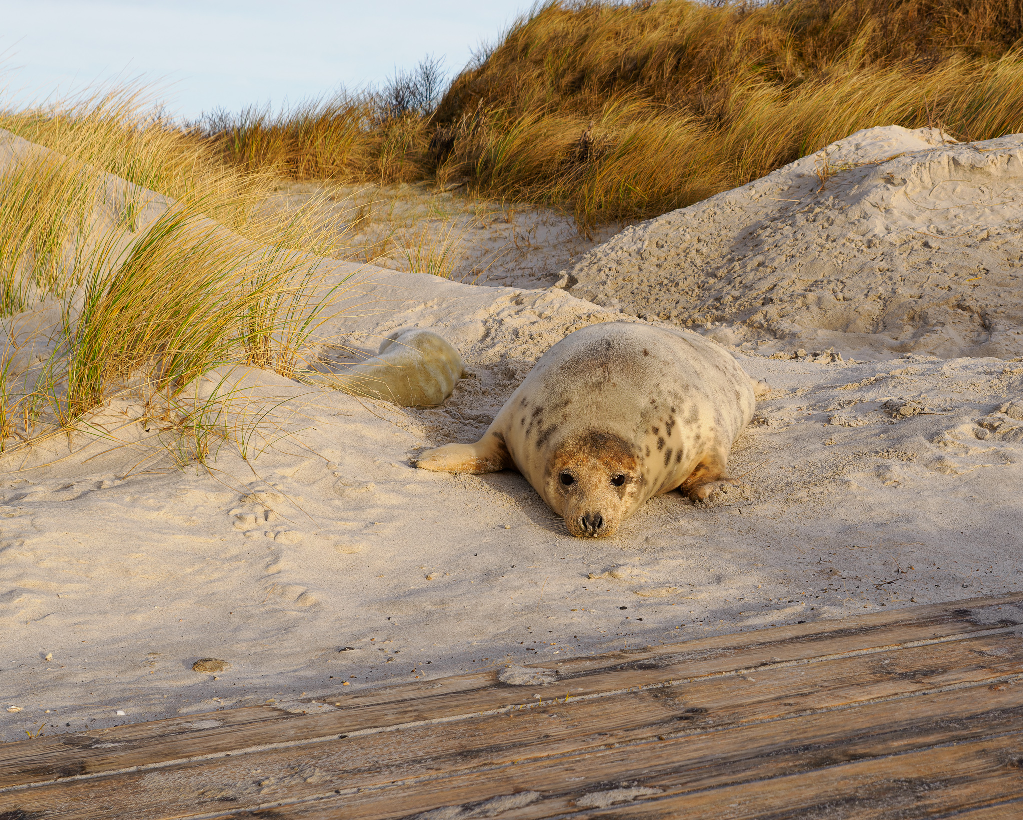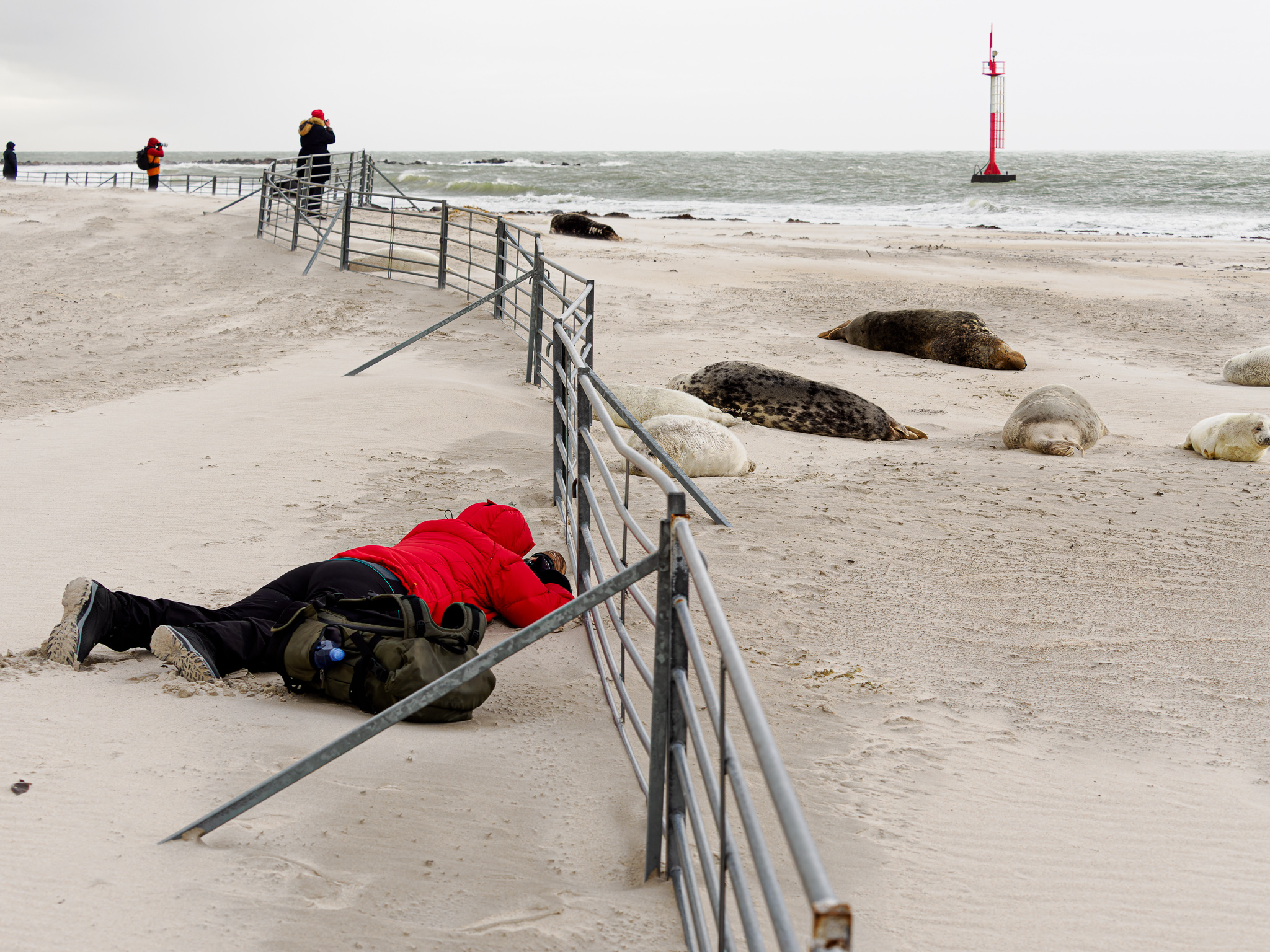 Ochranář nám říká, že letos tam mají asi 700 mláďat, je úžasné, že se jich tolik rodí. Helgoland je plný turistů, ale na Düne nás jezdí jen tak něco kolem 10, takže tu panuje naprostý klid. Většina turistů řeší svátky a konec roku, tuleni na Düne jsou pro ně až moc velký „extrém“.