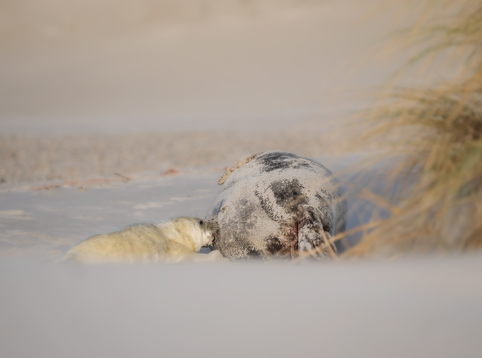 Jen jsme tiše leželi a pozorovali matku s mládětem. Jak se na sebe dívají, jak malého očichává, a on se snaží najít, kudy že teče to vydatné mateřské mléko. Tulení mláďata musejí hodně pít, protože s matkou zůstávají jen 4 až 6 týdnů. Pak už se musejí naučit být samostatní a živit se sami. Mláďata se rodí s váhou kolem 10 kg. Mají tedy za úkol svoji váhu v co nejkratším čase zdvojnásobit, aby přežila první dny bez matky. Přesto ztratí v téhle době až dvacet pět procent své původní váhy, a některá nepřežijí.