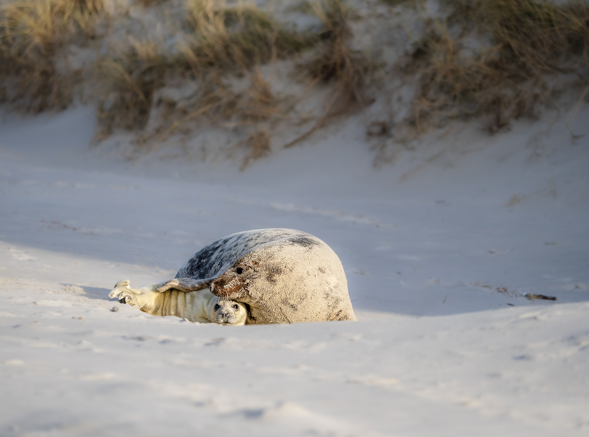 Jen jsme tiše leželi a pozorovali matku s mládětem. Jak se na sebe dívají, jak malého očichává, a on se snaží najít, kudy že teče to vydatné mateřské mléko. Tulení mláďata musejí hodně pít, protože s matkou zůstávají jen 4 až 6 týdnů. Pak už se musejí naučit být samostatní a živit se sami. Mláďata se rodí s váhou kolem 10 kg. Mají tedy za úkol svoji váhu v co nejkratším čase zdvojnásobit, aby přežila první dny bez matky. Přesto ztratí v téhle době až dvacet pět procent své původní váhy, a některá nepřežijí.